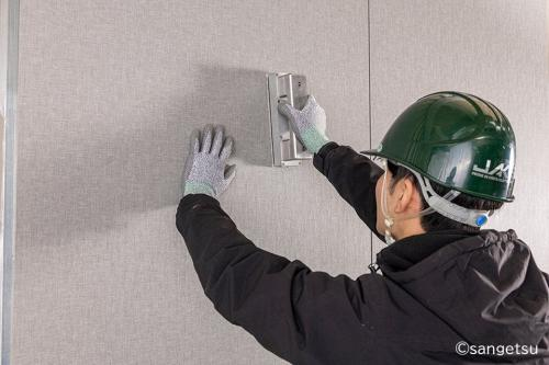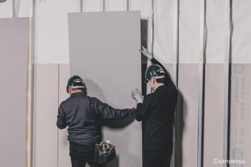 まず「工期短縮」では、吉野石膏の「スマートJG工法(磁石と専用テープによる施工)」を参考取付工法として採用。ビスを使用しないため、パテ処理といった下地補修がなくなる他、イノパネルは石膏ボードと壁紙があらかじめラミネート加工されているため、現場での壁紙施工が不要となる。これにより、現場作業の負担を軽減し、施工時間を100平方メートル あたり約180分の短縮が期待できる。