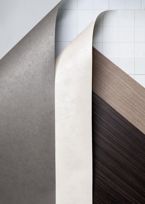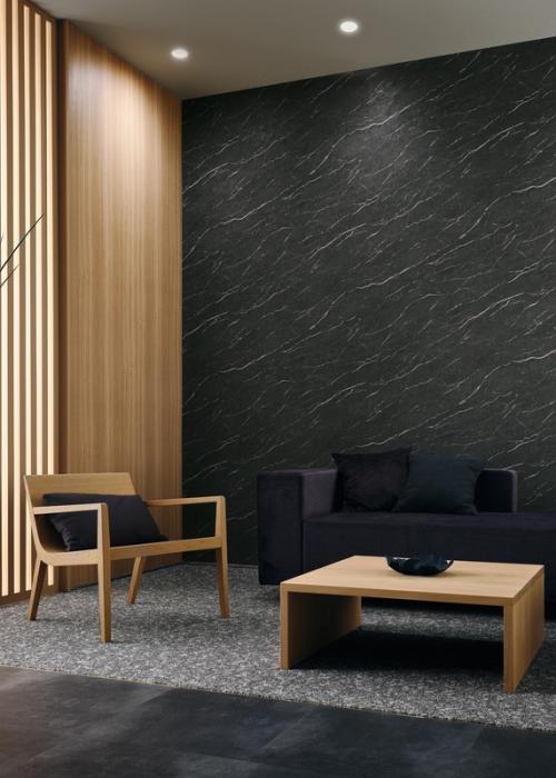 今回の新作発売では、マテリアル柄(石目柄・抽象柄)を拡充(全体の約4割)、空間提案がさらに広がるラインアップとなった。また同柄同色の粘着剤付き化粧フィルム「ハーデック」においてもマテリアル柄を初収録した。収録点数も前回の343点から397点に拡大した。