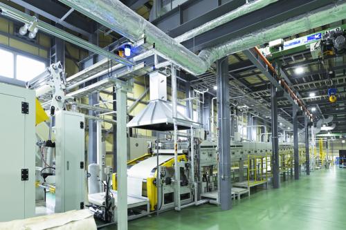 壁紙市場では、量産壁紙における需給のタイト化が進んでおり、供給体制の強化が急務となっている。こうした背景を受けて、クレアネイトでは2022年から広島県東広島市に新工場の建設を進めてきた。今回の新事業所稼働により壁紙生産設備としてのキャパシティは年間約8000万mの増加を見込んでおり、既存の2拠点(岩手県・一関事業所、千葉県・成田事業所)と合わせた3拠点体制により、壁紙の安定供給を持続的に実現していく。