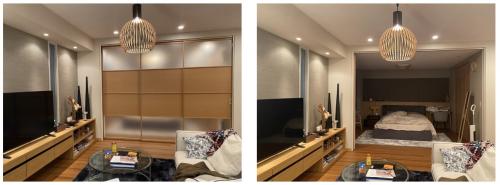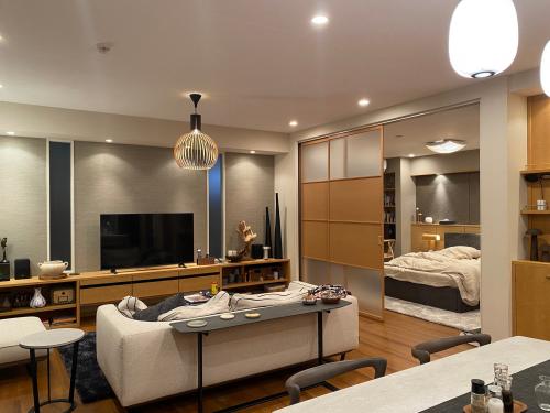 立川ブラインド工業は、そんな2人の主人公が暮らすマンションに、木目調フレームが印象的な間仕切「プレイス スウィング」を提供している。家具や床材と間仕切りを明るい木目調で統一することで部屋全体の一体感を実現している。またノンレール仕様のため、全開時に床にラインが入らず、空間に奥行き感が出て部屋全体がより広く見える。