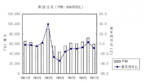 種別では持家が1万7901戸(同9.5%減)と8カ月連続の減少、貸家が2万5253戸(同5.5%減)と先月の増加から再びの減少、分譲住宅は1万6103戸(同11.3%減)と先月の増加から再びの減少となった。また分譲住宅のうちマンションが5551戸(同29.7%減)と先月の増加から再びの減少、一戸建住宅は1万389戸(同2.6%増)と2カ月連続の増加となった。