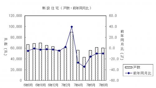 種別では持家が1万7532戸(同10.6%減)と5カ月連続の減少、貸家が2万6585戸(同8.1%減)と5カ月連続の減少、分譲住宅は1万5819戸(同8.2%減)と5カ月連続の減少となった。また分譲住宅のうちマンションが6148戸(同18.0%減)と5カ月連続の減少、一戸建住宅は9476戸(同10.9%減)と5カ月連続の減少となった。