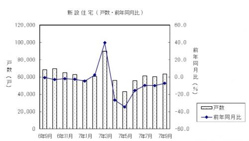 種別では持家が1万8237戸(同5.6%減)と6カ月連続の減少、貸家が2万8494戸(同8.2%減)と6カ月連続の減少、分譲住宅は1万6428戸(同8.3%減)と6カ月連続の減少となった。また分譲住宅のうちマンションが6121戸(同20.0%減)と6カ月連続の減少、一戸建住宅は1万70戸(同0.4%減)と6カ月連続の減少となった。