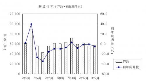 種別では持家が1万5501戸(同4.7%減)と先月の増加から再びの減少、貸家が2万5042戸(同2.7%減)と4カ月連続の減少、分譲住宅は1万6613戸(同8.8%減)と2カ月連続の減少となった。また分譲住宅のうちマンションが6440戸(同23.5%減)と2カ月連続の減少、一戸建住宅は9893戸(同2.8%増)と5カ月連続の増加となった。