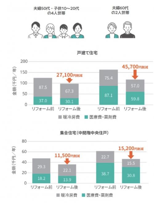 また集合住宅は、隣接する住戸の影響で、戸建て住宅より温度変化が小さく、暖冷房費・医療費・薬剤費ともに少なくなるため、窓リフォームによる削減効果は戸建て住宅のほうが大きくはなるが、戸建て住宅と同様に、集合住宅も夫婦60代の2人世帯の方が、削減効果が大きい結果となった。