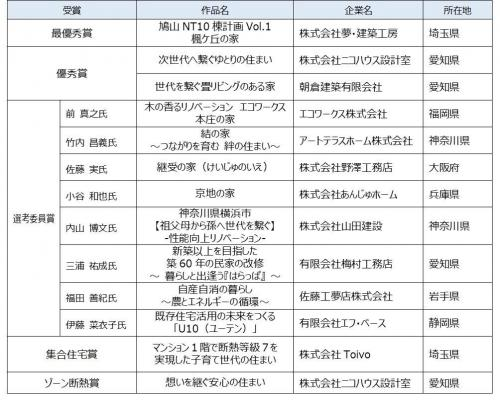 4回目の開催となる今回は、「これからを暮らす家の新しいスタンダードをつくる」をテーマに「性能向上リノベーション」の実例を募集、特に「断熱性能」と「耐震性能」の向上を実現したプロセスに注目し、4つの評価視点によりノミネート作品を選出し、その中から業界有識者による最終選考会にて最優秀賞・優秀賞・選考委員賞など各賞を選出した。