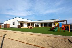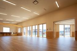 建屋のコンセプトは「四季を感じる自然調和」。建物をL 字型に配置することで日当たりと防風を両立し、省エネにも配慮した。内部には可動間仕切りによる可変性のある保育室、多様な活動スペース、自園調理のための厨房、人工芝の園庭を備えている。